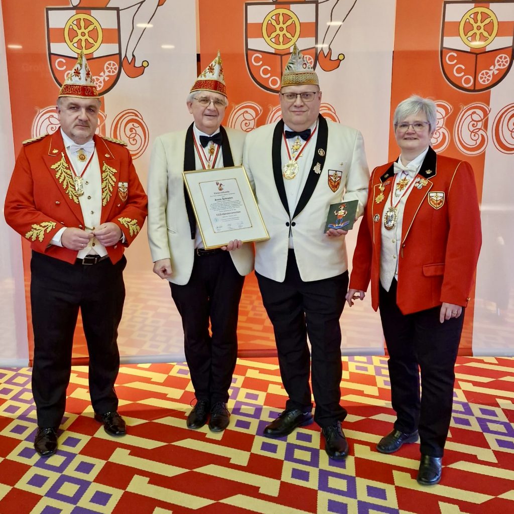 Foto: Während des CCO- Aktivenempfang erhielt CCO- Elferrat Armin Schramm mit dem CCO- Heinzemännchen die höchste karnevalistische Auszeichnung des Vereins.Von links: 2. CCO- Vorsitzender Thomas Grebel, 1. CCO- Vorsitzender Helmut Hohl, Armin Schramm, 2. CCO- Vorsitzende Eva Bonn